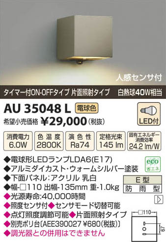 | 補足・注意事項 | ◆消費電力:6.0W ◆色温度:2800K ◆演色性:Ra74 ◆光源寿命:40,000時間 ◆照度センサ付 ◆センサモード切替可能 ◆点灯照度調節可能 ◆片面照射タイプ ◆別売ポリ台〔AEE390027 \(税込)〕 ◆調光器との併用はできません ※白熱球40W相当 |