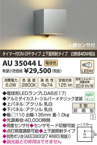 | 補足・注意事項 | ◆消費電力:6.0W ◆色温度:2800K ◆演色性:Ra74 ◆光源寿命:40,000時間 ◆照度センサ付 ◆センサモード切替可能 ◆点灯照度調節可能 ◆上下面照射タイプ ◆別売ポリ台〔AEE390027 \(税込)〕 ◆調光器との併用はできません ※白熱球40W相当 |