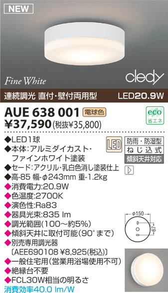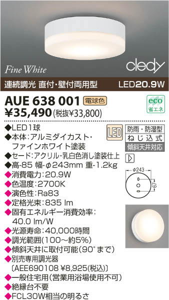 | 補足・注意事項 | ◆消費電力:20.9W ◆色温度:2700K ◆演色性:Ra83 ◆光源寿命:40,000時間 ◆調光範囲(100~約5%) ◆傾斜天井に取付可能(90°まで) ◆一般住宅用(営業用浴場使用不可) ◆絶縁台不要 ◆FCL30W相当の明るさ ◆別売専用調光器〔AEE690108 \8,925(税込)〕 |