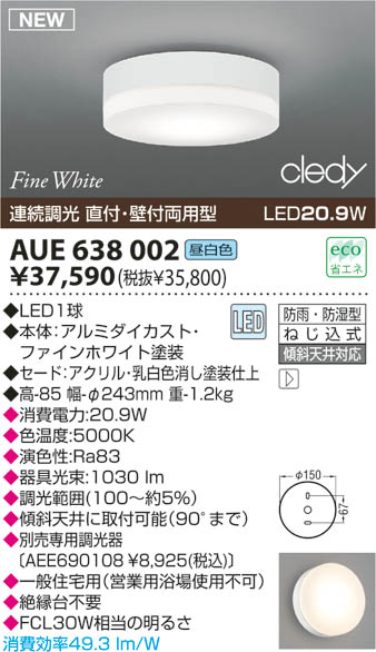 | 補足・注意事項 | ◆消費電力:20.9W ◆色温度:5000K ◆演色性:Ra83 ◆光源寿命:40,000時間 ◆調光範囲(100~約5%) ◆傾斜天井に取付可能(90°まで) ◆一般住宅用(営業用浴場使用不可) ◆絶縁台不要 ◆FCL30W相当の明るさ ◆別売専用調光器〔AEE690108 \8,925(税込)〕 |
