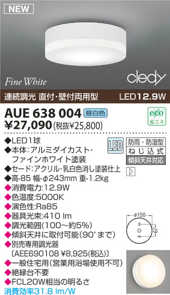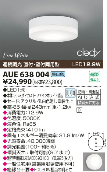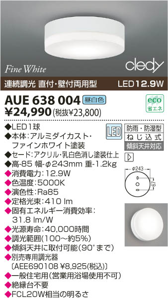 | 補足・注意事項 | ◆消費電力:12.9W ◆色温度:5000K ◆演色性:Ra85 ◆光源寿命:40,000時間 ◆調光範囲(100~約5%) ◆傾斜天井に取付可能(90°まで) ◆一般住宅用(営業用浴場使用不可) ◆絶縁台不要 ◆FCL20W相当の明るさ ◆別売専用調光器〔AEE690108 \8,925(税込)〕 |