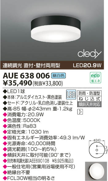 | 補足・注意事項 | ◆消費電力:20.9W ◆色温度:5000K ◆演色性:Ra83 ◆光源寿命:40,000時間 ◆調光範囲(100~約5%) ◆傾斜天井に取付可能(90°まで) ◆一般住宅用(営業用浴場使用不可) ◆絶縁台不要 ◆FCL30W相当の明るさ ◆別売専用調光器〔AEE690108 \8,925(税込)〕 |