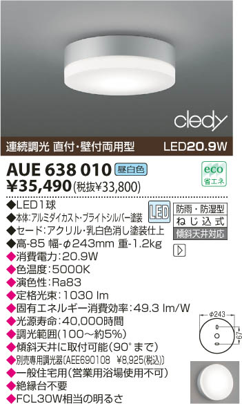 | 補足・注意事項 | ◆消費電力:20.9W ◆色温度:5000K ◆演色性:Ra83 ◆光源寿命:40,000時間 ◆調光範囲(100~約5%) ◆傾斜天井に取付可能(90°まで) ◆一般住宅用(営業用浴場使用不可) ◆絶縁台不要 ◆FCL30W相当の明るさ ◆別売専用調光器〔AEE690108 \8,925(税込)〕 |