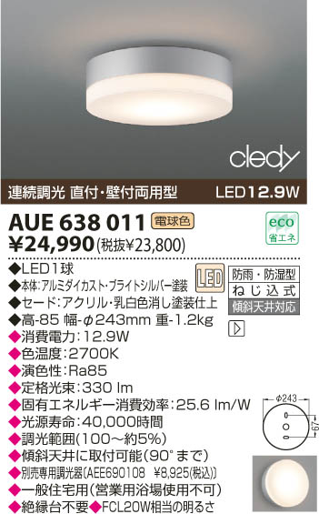 | 補足・注意事項 | ◆消費電力:12.9W ◆色温度:2700K ◆演色性:Ra85 ◆光源寿命:40,000時間 ◆調光範囲(100~約5%) ◆傾斜天井に取付可能(90°まで) ◆一般住宅用(営業用浴場使用不可) ◆絶縁台不要 ◆FCL20W相当の明るさ ◆別売専用調光器〔AEE690108 \8,925(税込)〕 |