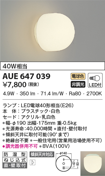 | 補足・注意事項 | ◆消費電力:4.9W ◆色温度:2700K ◆演色性:Ra80 ◆光源寿命:40,000時間 ◆直付・壁付取付 ◆傾斜天井に取付可能(90°まで) ◆絶縁台不要 ◆一般住宅用(営業用浴場使用不可) ◆調光器併用不可 |