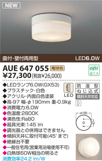 | 補足・注意事項 | ◆消費電力:6.0W ◆色温度:2800K ◆演色性:Ra80 ◆調光器との併用はできません ◆傾斜天井に取付可能(45°まで) ◆絶縁台不要 ◆一般住宅用(営業用浴場使用不可) ◆白熱球60W相当の明るさ |