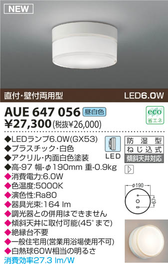 | 補足・注意事項 | ◆消費電力:6.0W ◆色温度:5000K ◆演色性:Ra80 ◆調光器との併用はできません ◆傾斜天井に取付可能(45°まで) ◆絶縁台不要 ◆一般住宅用(営業用浴場使用不可) ◆白熱球60W相当の明るさ |