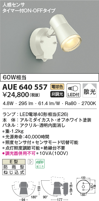 | 補足・注意事項 | ◆消費電力:4.8W ◆色温度:2700K ◆演色性:Ra80 ◆光源寿命:40,000時間 ◆照度センサ付 ◆センサモード切替可能 ◆点灯照度調節可能 ◆絶縁台不要 ◆調光器併用不可 |