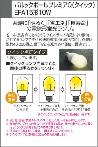 | 補足・注意事項 | ◆消費電力:10.0W ◆パルックボールプレミアQ(クイック)同梱器具 ◆傾斜天井に取付可能(45°まで) ◆白熱球60W相当の明るさ |