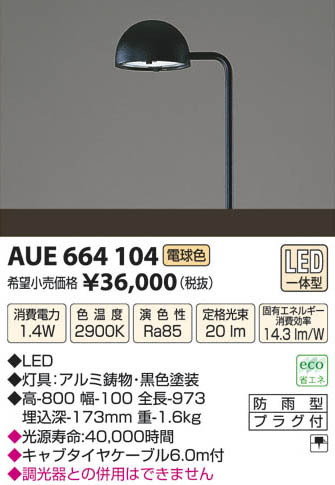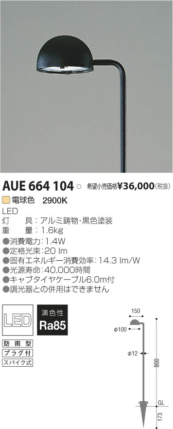 | 補足・注意事項 | ◆消費電力:1.4W ◆色温度:2900K ◆演色性:Ra85 ◆光源寿命:40,000時間 ◆キャブタイヤケーブル6.0m付 ◆調光器との併用はできません |