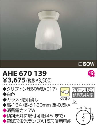 | 補足・注意事項 | ◆消費電力:47.0W ◆傾斜天井に取付可能(45°まで) ◆電球形蛍光ランプA15形使用可能 |