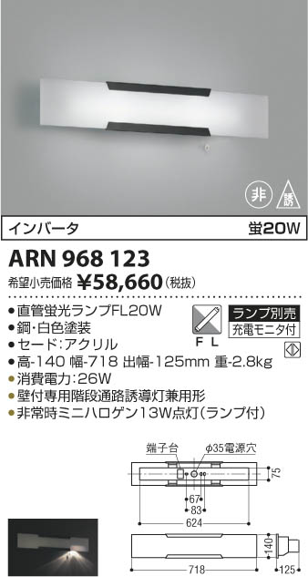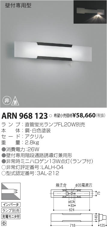 | 補足・注意事項 | ◆消費電力:26W ◆壁付専用階段通路誘導灯兼用形 ◆非常時ミニハロゲン13W点灯(ランプ付) ◆非常灯評定番号:LALH-04 ◆型式認定番号:3AL-212 |
