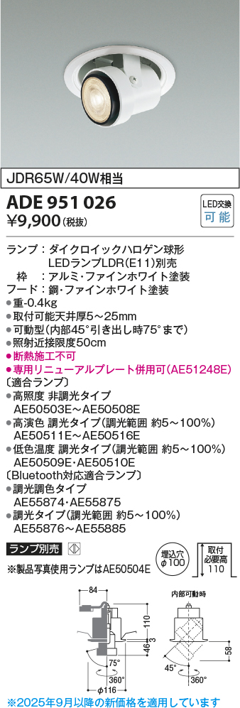 | 補足・注意事項 | ◆取付可能天井厚5~25mm ◆可動型(内部45°引き出し時75°まで) ◆照射近接限度10cm ◆[適合ランプ] 高照度 非調光タイプ AE50503E~AE50508E 高演色 調光タイプ(調光範囲約5~100%)AE50511E~AE50516E 低色温度 調光タイプ(調光範囲約5~100%)AE50509E・AE50510E [Bluetooth対応適合ランプ] 調光調色タイプ AE55874・AE55875 調光タイプ(調光範囲約5~100%)AE55876~AE55885 ◆専用リニューアルプレート併用可(AE51248E) |