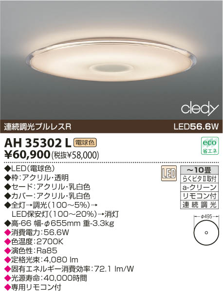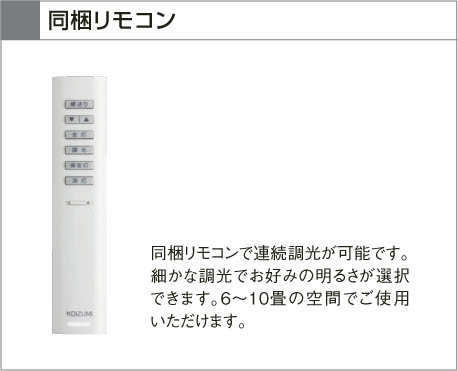 | 補足・注意事項 | ◆消費電力:56.6W ◆色温度:2700K ◆演色性:Ra85 ◆光源寿命:40,000時間 ◆専用リモコン付 |