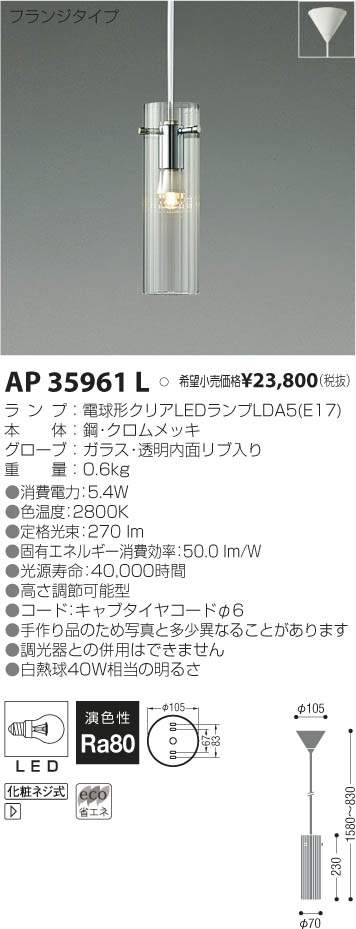 | 補足・注意事項 | ◆消費電力:5.4W ◆色温度:2800K ◆演色性:Ra80 ◆光源寿命:40,000時間 ◆高さ調節可能型 ◆コード・キャブタイヤコードφ6 ◆手作り品のため写真と多少異なることがあります ◆調光器との併用はできません ※白熱球40W相当 |