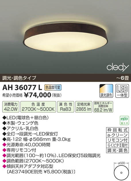 | 補足・注意事項 | ◆消費電力:42.0W ◆色温度:2700K ◆演色性:Ra83 ◆光源寿命:40,000時間 ◆専用リモコン付 ◆調光範囲(100~約10%)、LED保安灯5段階調光 ◆調色範囲(2700K~5000K) ◆傾斜天井アダプタ対応型〔AE37490E \(税込)〕 |