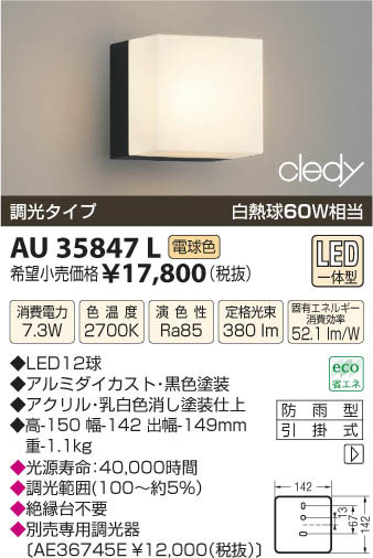 | 補足・注意事項 | ◆消費電力:7.3W ◆色温度:2700K ◆演色性:Ra85 ◆光源寿命:40,000時間 ◆調光範囲(100~約5%) ◆絶縁台不要 ◆白熱球60W相当の明るさ ◆別売専用調光器〔AEE690108 \8,925(税込)〕 |