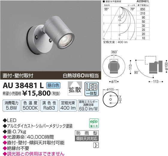| 補足・注意事項 | ◆消費電力:5.8W ◆色温度:5000K ◆演色性:Ra83 ◆光源寿命:40,000時間 ◆直付・壁付・傾斜天井取付可能 ◆絶縁台不要 ◆調光器との併用はできません ※白熱球60W相当 |