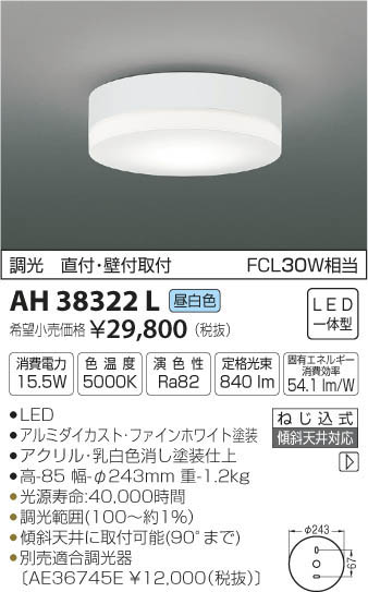 | 補足・注意事項 | ◆消費電力:15.5W ◆色温度:5000K ◆演色性:Ra82 ◆光源寿命:40,000時間 ◆調光範囲(100~約1%) ◆傾斜天井に取付可能(90°まで) ◆別売適合調光器〔AE36745E \12,000(税抜)〕 ※色温度:5000K ※FCL30W相当 |