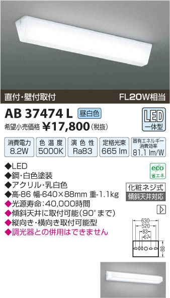 | 補足・注意事項 | ◆消費電力:8.2W ◆色温度:5000K ◆演色性:Ra83 ◆光源寿命:40,000時間 ◆傾斜天井に取付可能(90°まで) ◆縦向き・横向き取付可能型 ◆調光器との併用はできません ※FL20W相当 |