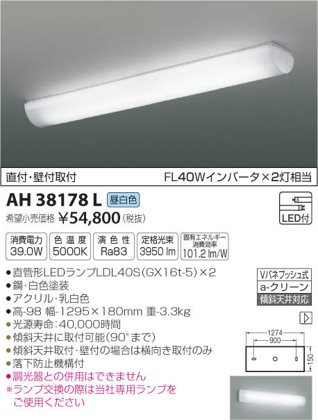 | 補足・注意事項 | ◆消費電力:39W ◆色温度:5000K ◆演色性:Ra83 ◆光源寿命:40,000時間 ◆傾斜天井に取付可能(90°まで) ◆傾斜天井取付・壁付の場合は横向き取付のみ ◆落下防止機構付 ◆調光器との併用はできません ※ランプ交換の際は当社専用ランプをご使用ください ※色温度:5000K ※FL40Wインバータ×2灯相当 |