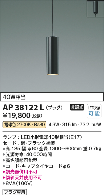 | 補足・注意事項 | ◆消費電力:4.3W ◆光束値:315lm ◆8VA(100V) ◆色温度:2700K ◆演色性:Ra80 ◆光源寿命:40,000時間 ◆高さ調節可能型 ◆コード・キャブタイヤコードφ6 ◆調光器併用不可 ◆傾斜天井使用不可 |