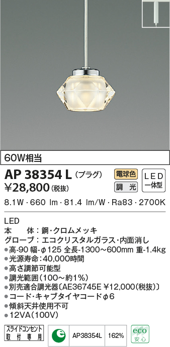 | 補足・注意事項 | ◆消費電力:8.1W ◆色温度:2700K ◆演色性:Ra83 ◆光源寿命:40,000時間 ◆高さ調節可能型 ◆調光範囲(100~約1%) ◆別売適合調光器〔AE36745E \12,000(税抜)〕 ◆コード・キャブタイヤコードφ6 ◆傾斜天井使用不可 |