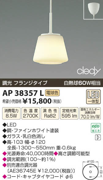 | 補足・注意事項 | ◆消費電力:8.5W ◆色温度:2700K ◆演色性:Ra82 ◆光源寿命:40,000時間 ◆高さ調節可能型 ◆調光範囲(100~約1%) ◆コード・キャブタイヤコード φ6 ◆別売適合調光器〔AE36745E \12,000(税抜)〕 ※白熱球60W相当 |