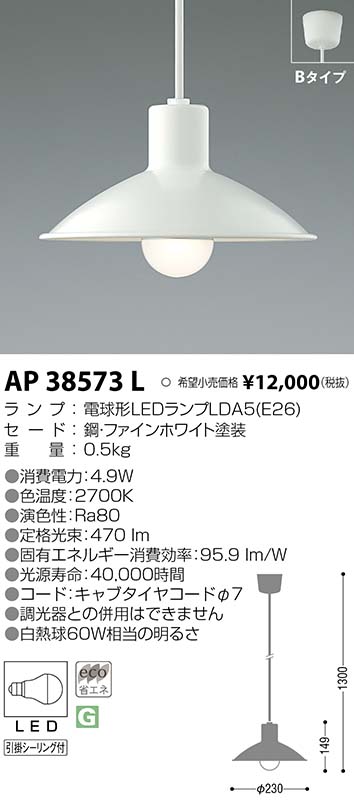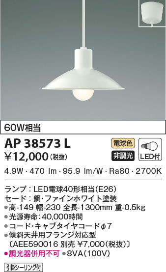 | 補足・注意事項 | ◆消費電力:4.9W ◆色温度:2700K ◆演色性:Ra80 ◆光源寿命:40,000時間 ◆コード・キャブタイヤコードφ7 ◆傾斜天井用フランジ対応型〔AEE590016 別売 \7,000(税抜)〕 ◆調光器併用不可 |