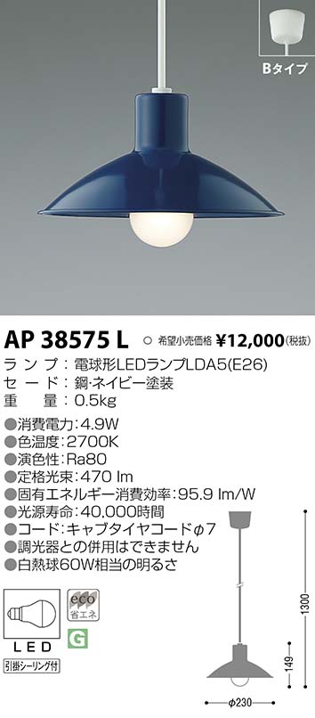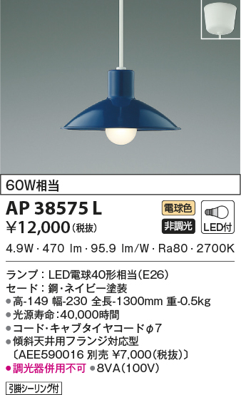 | 補足・注意事項 | ◆消費電力:4.9W ◆色温度:2700K ◆演色性:Ra80 ◆光源寿命:40,000時間 ◆コード・キャブタイヤコードφ7 ◆傾斜天井用フランジ対応型〔AEE590016 別売 \7,000(税抜)〕 ◆調光器併用不可 |