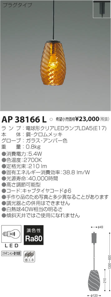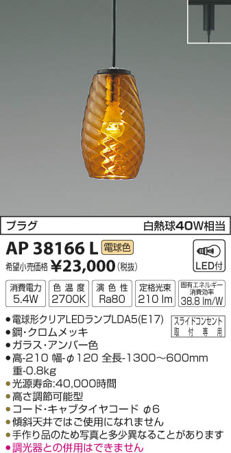 | 補足・注意事項 | ◆消費電力:5.4W ◆色温度:2700K ◆演色性:Ra80 ◆傾斜天井ではご使用になれません ◆光源寿命:40,000時間 ◆高さ調節可能型 ◆コード:キャブタイヤコードφ6 ◆手作り品のため写真と多少異なることがあります ◆調光器との併用はできません ◆白熱球40W相当の明るさ ※白熱球40W相当 |