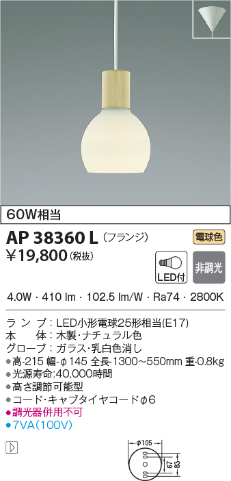 | 補足・注意事項 | ◆消費電力:4.0W ◆光束値:410lm ◆7VA(100V) ◆色温度:2800K ◆演色性:Ra74 ◆光源寿命:40,000時間 ◆高さ調節可能型 ◆コード・キャブタイヤコードφ6 ◆調光器併用不可 |