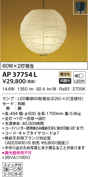 | 補足・注意事項 | ◆消費電力:14.6W ◆色温度:2700K ◆演色性:Ra83 ◆光源寿命:40,000時間 ◆コードハンガー使用時のみ傾斜天井に取付可能(45°まで) ◆コード・キャブタイヤコードφ7 ◆傾斜天井用フランジ対応型〔AEE590016 別売 \8,800(税抜)〕 ◆手作り品のため写真と多少異なることがあります ◆調光器併用不可 |