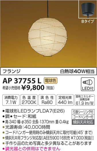 | 補足・注意事項 | ◆消費電力:7.1W ◆色温度:2700K ◆演色性:Ra80 ◆光源寿命:40,000時間 ◆傾斜天井用フランジ対応型〔AEE590016別売 \7,000(税抜)〕 ◆コードハンガー使用時のみ傾斜天井に取付可能(45°まで) ◆手作り品のため写真と多少異なることがあります ◆傾斜天井用フランジ対応型〔AEE590016別売 \7,000(税抜)〕 ◆調光器との併用はできません ※色温度:2700K ※白熱球40W相当 |
