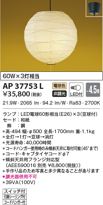 | 補足・注意事項 | ◆消費電力:21.9W ◆光束値:2065lm ◆39VA(100V) ◆色温度:2700K ◆演色性:Ra83 ◆光源寿命:40,000時間 ◆コードハンガー使用時のみ傾斜天井に取付可能(45°まで) ◆コード・キャブタイヤコードφ7 ◆傾斜天井用フランジ対応型〔AEE590016 別売 \8,800(税抜)〕 ◆手作り品のため写真と多少異なることがあります ◆調光器併用不可 |