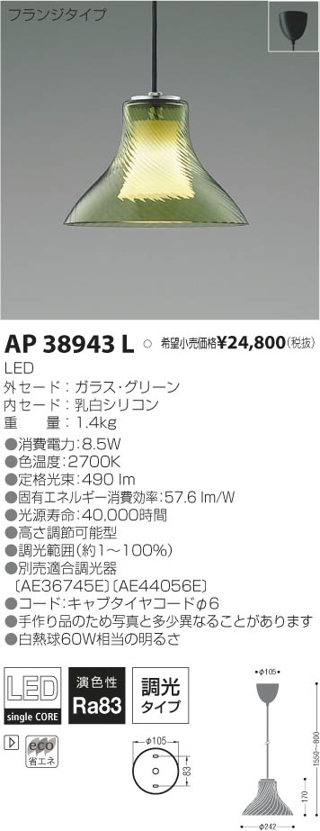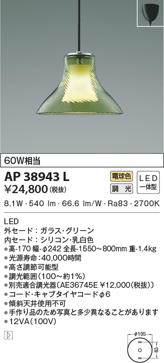 | 補足・注意事項 | ◆消費電力:8.1W ◆色温度:2700K ◆演色性:Ra83 ◆光源寿命:40,000時間 ◆高さ調節可能型 ◆調光範囲(100~約1%) ◆別売適合調光器〔AE36745E \12,000(税抜)〕 ◆コード・キャブタイヤコードφ6 ◆傾斜天井使用不可 ◆手作り品のため写真と多少異なることがあります |