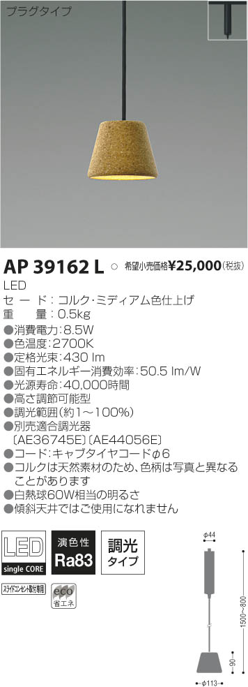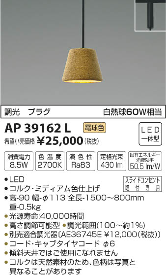 | 補足・注意事項 | ◆消費電力:8.5W ◆色温度:2700K ◆演色性:Ra83 ◆傾斜天井ではご使用になれません ◆光源寿命:40,000時間 ◆高さ調節可能型 ◆調光範囲(約1~100%) ◆別売適合調光器〔AE36745E \12,000(税抜)〕〔AE44056E \15,800(税抜)〕 ◆コード:キャブタイヤコードφ6 ◆コルクは天然素材のため、色柄は写真と異なることがあります ◆白熱球60W相当の明るさ ※白熱球60W相当 |