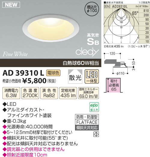 | 補足・注意事項 | ◆消費電力:6.3W ◆色温度:2700K ◆演色性:Ra82 ◆光源寿命:40,000時間 ◆5~12.5mmの材厚で取付けてください ◆傾斜天井に取付可能(55°まで) ◆配光は傾斜天井対応ではありません ◆調光器との併用はできません ◆照射近接限度10cm ※白熱球60W相当 |