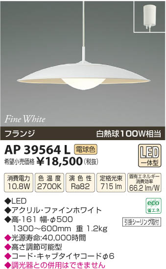 | 補足・注意事項 | ◆消費電力:10.8W ◆色温度:2700K ◆演色性:Ra82 ◆光源寿命:40,000時間 ◆高さ調節可能型 ◆コード・キャブタイヤコードφ6 ◆調光器との併用はできません ※白熱球100W相当 |