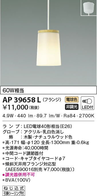 | 補足・注意事項 | ◆消費電力:4.9W ◆色温度:2700K ◆演色性:Ra84 ◆光源寿命:40,000時間 ◆中間コード調節器付 ◆コード・キャブタイヤコードφ7 ◆傾斜天井用フランジ対応型〔AEE590016 別売 \7,000(税抜)〕 ◆調光器併用不可 |