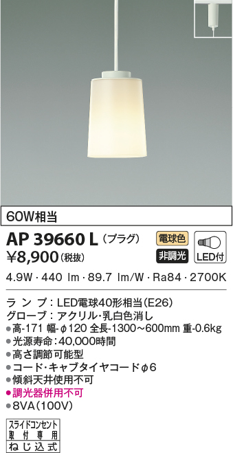 | 補足・注意事項 | ◆消費電力:4.9W ◆色温度:2700K ◆演色性:Ra84 ◆光源寿命:40,000時間 ◆高さ調節可能型 ◆コード・キャブタイヤコードφ6 ◆傾斜天井使用不可 ◆調光器併用不可 |