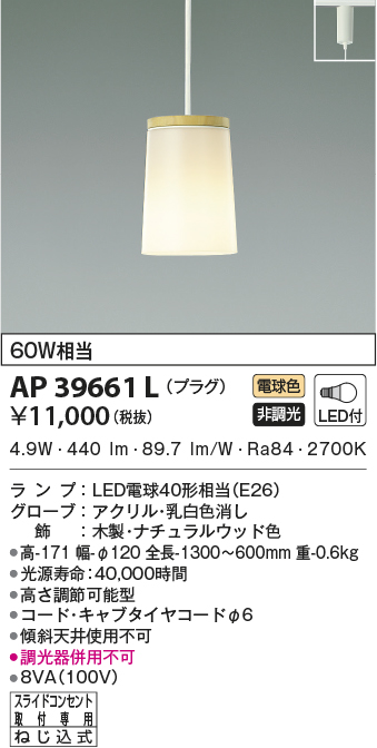 | 補足・注意事項 | ◆消費電力:4.9W ◆色温度:2700K ◆演色性:Ra84 ◆光源寿命:40,000時間 ◆高さ調節可能型 ◆コード・キャブタイヤコードφ6 ◆傾斜天井使用不可 ◆調光器併用不可 |