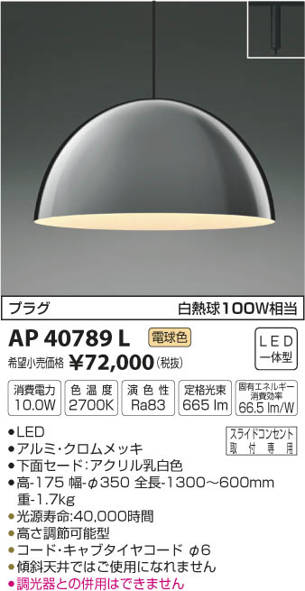 | 補足・注意事項 | ◆消費電力:10W ◆色温度:2700K ◆演色性:Ra83 ◆光源寿命:40,000時間 ◆高さ調節可能型 ◆コード:キャブタイヤコード φ6 ◆調光器との併用はできません ◆白熱球100W相当の明るさ ◆傾斜天井ではご使用になれません ※白熱球100W相当 |