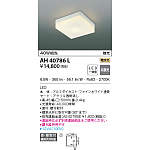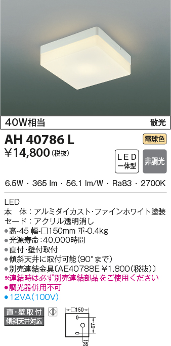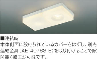 | 補足・注意事項 | ◆消費電力:6.5W ◆光束値:365lm ◆12VA(100V) ◆色温度:2700K ◆演色性:Ra83 ◆光源寿命:40,000時間 ◆直付・壁付取付 ◆傾斜天井に取付可能(90°まで) ◆別売連結金具〔AE40788E \1,800(税抜)〕 ◆調光器併用不可 ※連結時は必ず別売連結部品をご使用ください |