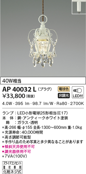 | 補足・注意事項 | ◆消費電力:4.0W ◆光束値:395lm ◆7VA(100V) ◆色温度:2700K ◆演色性:Ra80 ◆光源寿命:40,000時間 ◆高さ調節可能型 ◆手作り品のため写真と多少異なることがあります ◆調光器併用不可 ◆傾斜天井使用不可 |