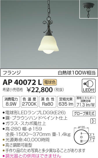 | 補足・注意事項 | ◆消費電力:8.9W ◆色温度:2700K ◆演色性:Ra80 ◆光源寿命:40,000時間 ◆高さ調節可能型 ◆手作り品のため写真と多少異なることがあります ◆調光器との併用はできません ※色温度:2700K ※白熱球100W相当 |