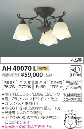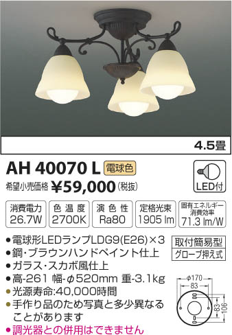 | 補足・注意事項 | ◆消費電力:26.7W ◆色温度:2700K ◆演色性:Ra80 ◆光源寿命:40,000時間 ◆手作り品のため写真と多少異なることがあります ◆調光器との併用はできません ※色温度:2700K |