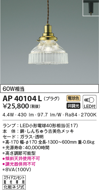 | 補足・注意事項 | ◆消費電力:4.4W ◆光束値:430lm ◆8VA(100V) ◆色温度:2700K ◆演色性:Ra84 ◆光源寿命:40,000時間 ◆高さ調節可能型 ◆調光器併用不可 ◆傾斜天井使用不可 |
