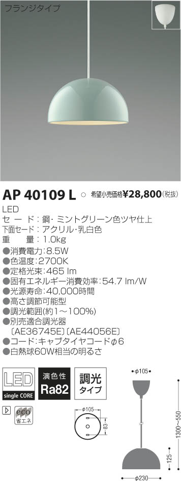 | 補足・注意事項 | ◆消費電力:8.5W ◆色温度:2700K ◆演色性:Ra82 ◆光源寿命:40,000時間 ◆高さ調節可能型 ◆調光範囲(100~約1%) ◆コード・キャブタイヤコード φ6 ◆別売適合調光器〔AE36745E \12,000(税抜)〕 ※白熱球60W相当 |