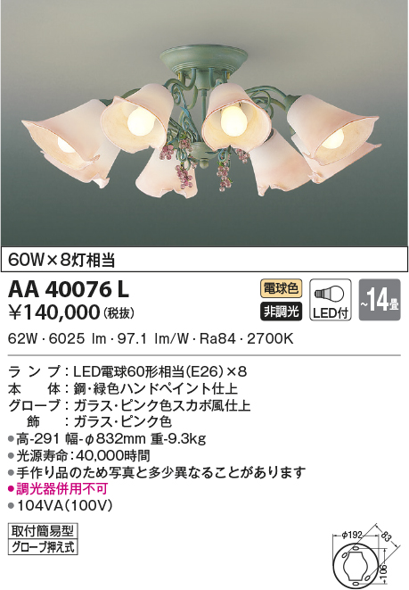 | 補足・注意事項 | ◆消費電力:62.0W ◆光束値:6025lm ◆104VA(100V) ◆色温度:2700K ◆演色性:Ra84 ◆光源寿命:40,000時間 ◆手作り品のため写真と多少異なることがあります ◆調光器併用不可 |